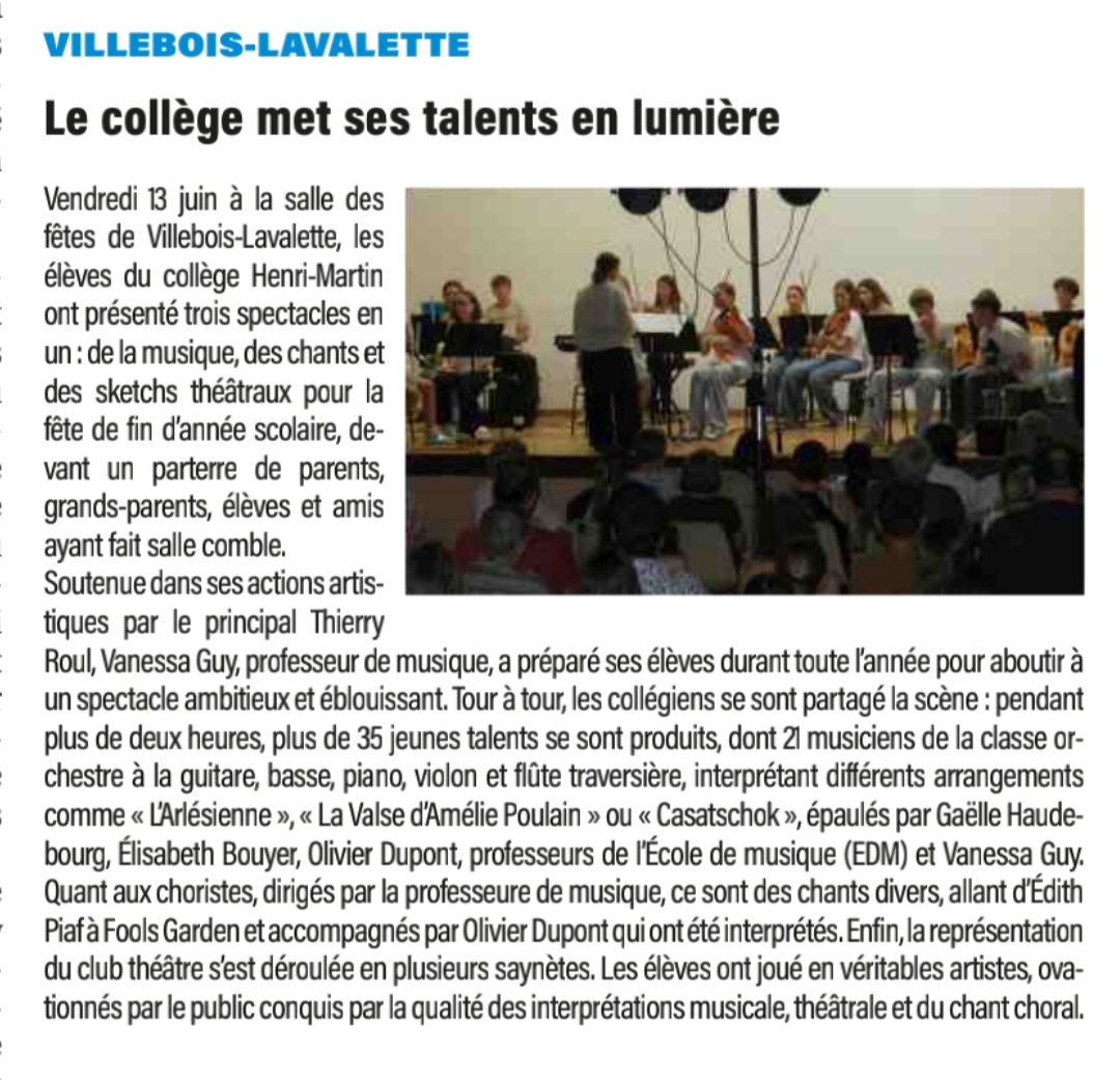 Aujourd'hui, la classe orchestre a joué lors de la visite au collège de M. Claverie, Directeur académique des services de l'Education Nationale en Charente. Les jeunes musiciens ont donné à entendre une belle qualité musicale ; félicitations à eux !